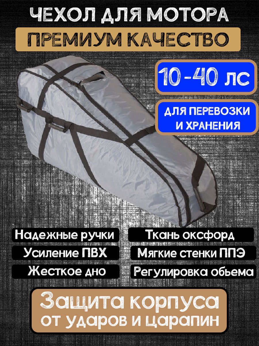 Конструкция данного кофра рассчитана на двухтактные лодочные моторы мощностью от 10 до 40 л.с. Ручки сделаны таким образом чтобы равномерно распределять вес мотора и транспортировка мотора была максимально комфортной. Чехол защитит мотор от мелких повреждений лакокрасочного покрытия. Защитит мотор от грязи во время транспортировки и сбережет от пыли во время хранения.